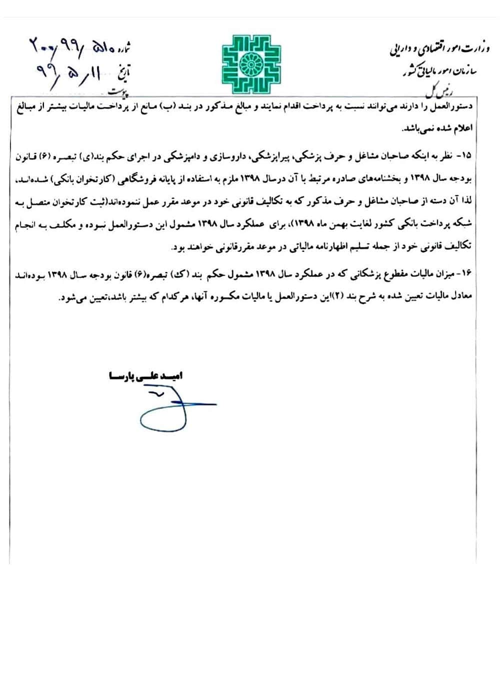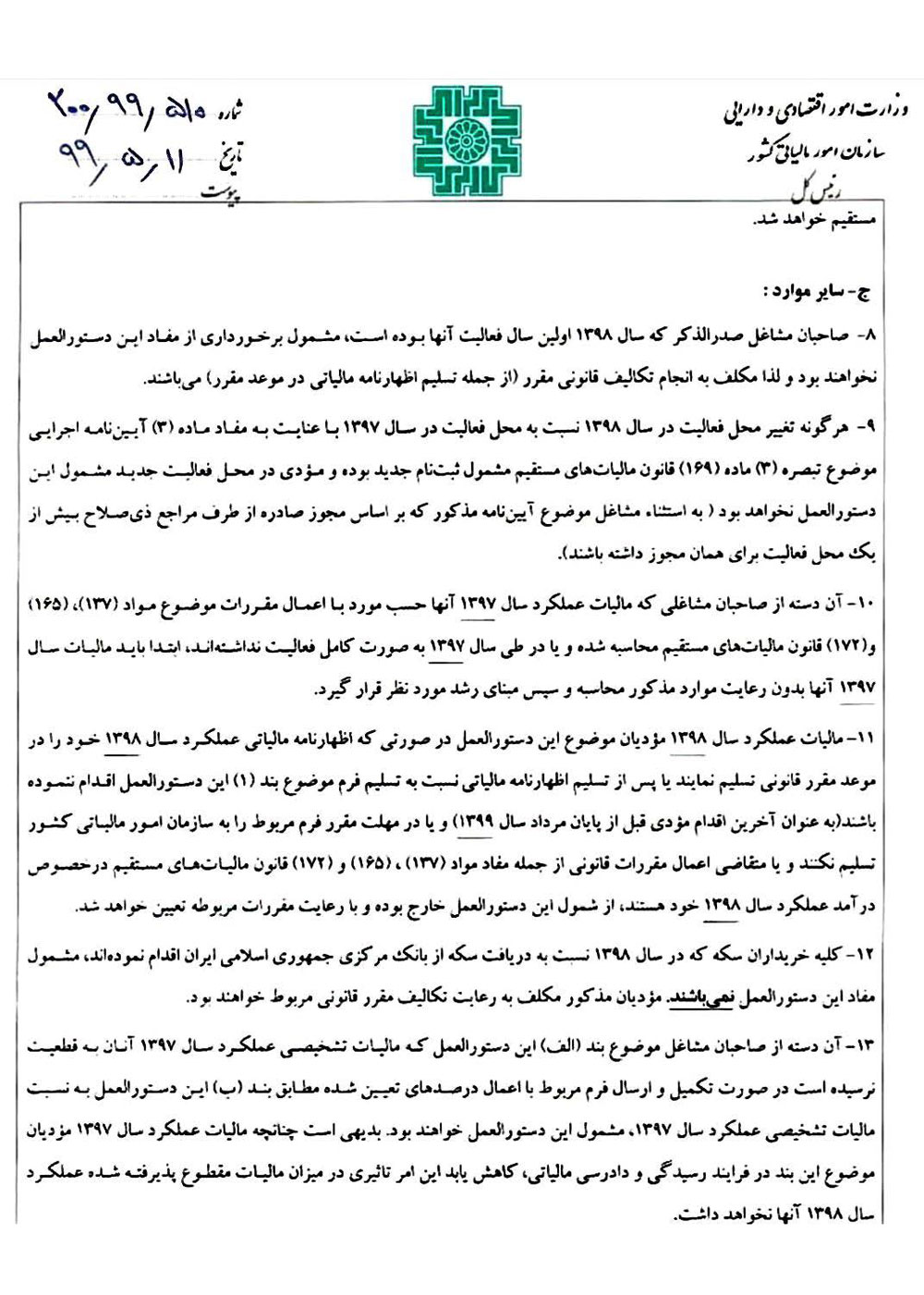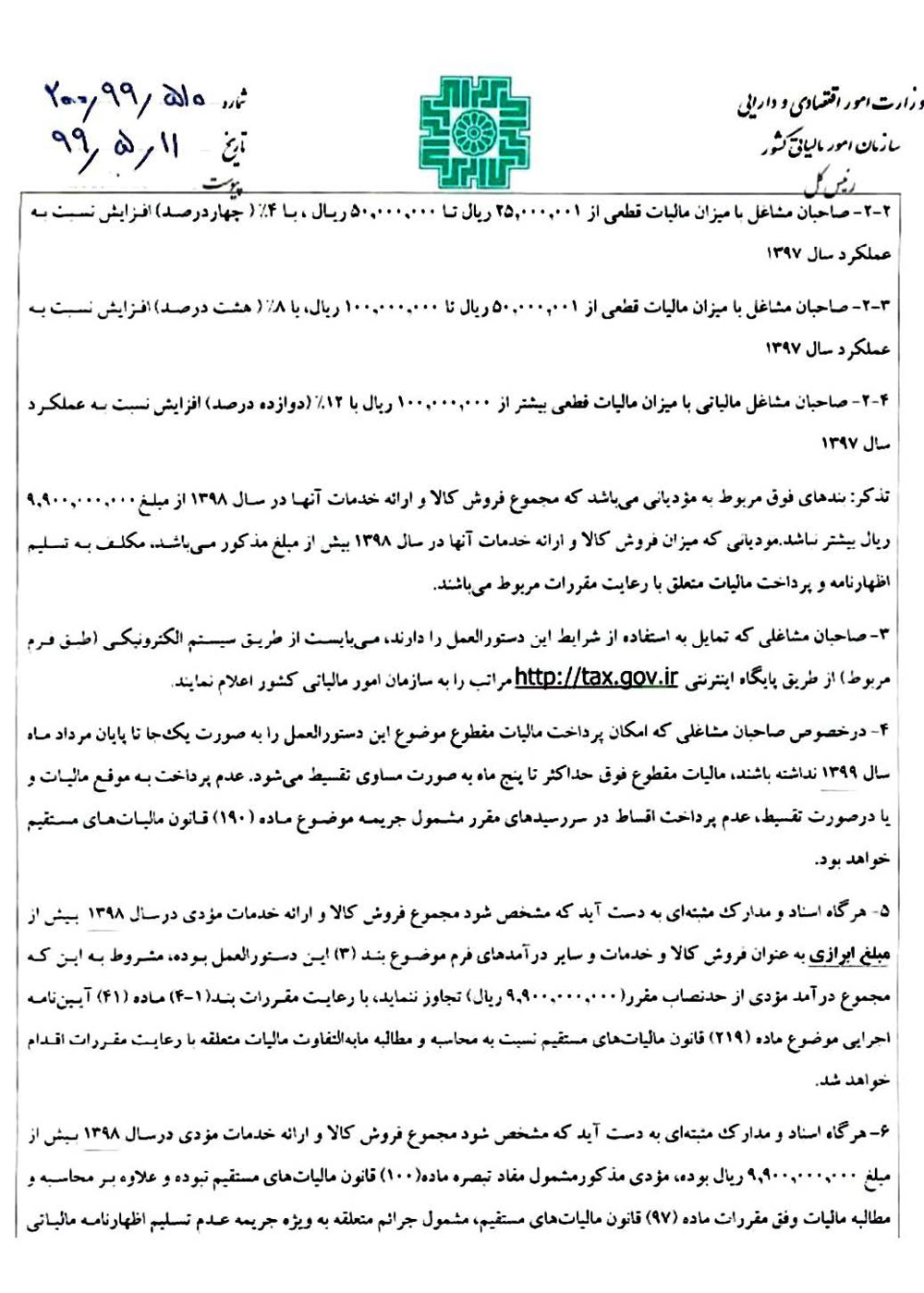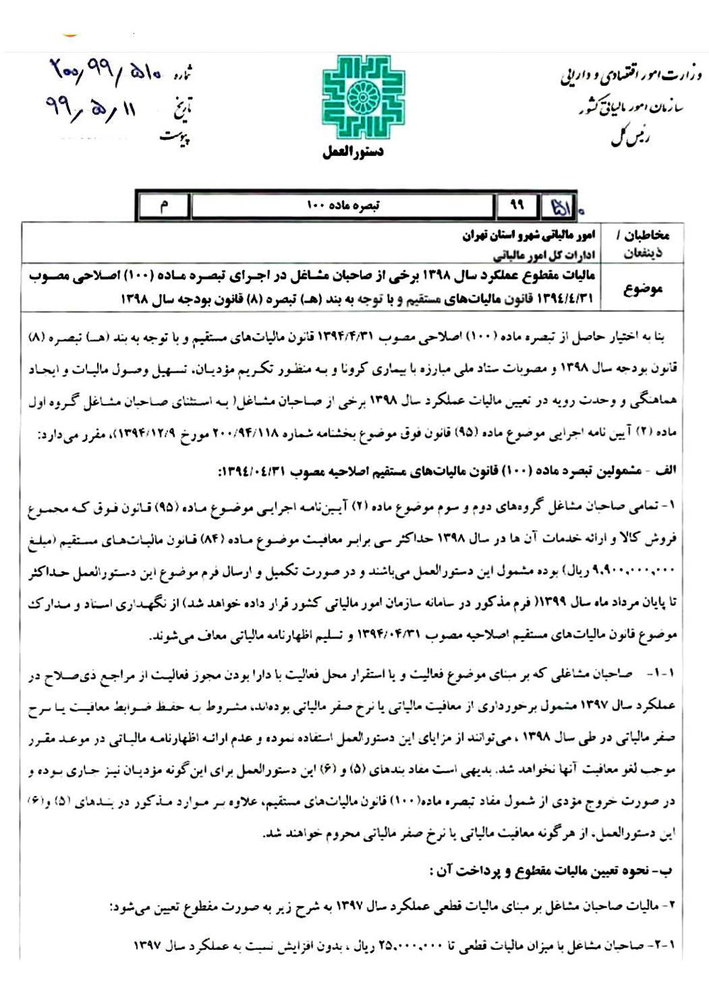 بنا به اختیار حاصل از تبصره ماده 100 اصلاحی مصوب 1394/4/31 قانون مالیاتهای مستقیم و با توجه به بند هـ تبصره 8 قانون بودجه سال 1398 و مصوبات ستاد ملی مبارزه با بیماری کرونا و بهمنظور تکریم مؤدیان، تسهیل وصول مالیات و ایجاد هماهنگی و وحدت رویه در تعیین مالیات عملکرد سال 1398 برخی از صاحبان مشاغل (بهاستثنای صاحبان مشاغل گروه اول ماده (2) آییننامه اجرایی موضوع ماده (95) قانون فوق موضوع بخشنامه شماره 200/94/118 مورخ 1394/9/12)، مقرر میدارد: